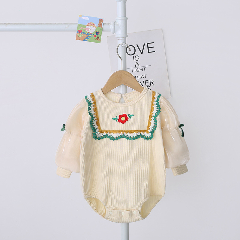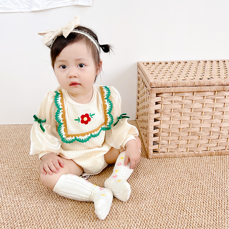 This is a long-sleeve triangle climb romper for newborn baby girls ages 0-1 years who need soft, comfortable, and cozy everyday wear. Made from 96% soft cotton with Class A safety rating, it features a classic pullover style perfect for spring and autumn. The boneless construction ensures smooth seams against delicate skin.