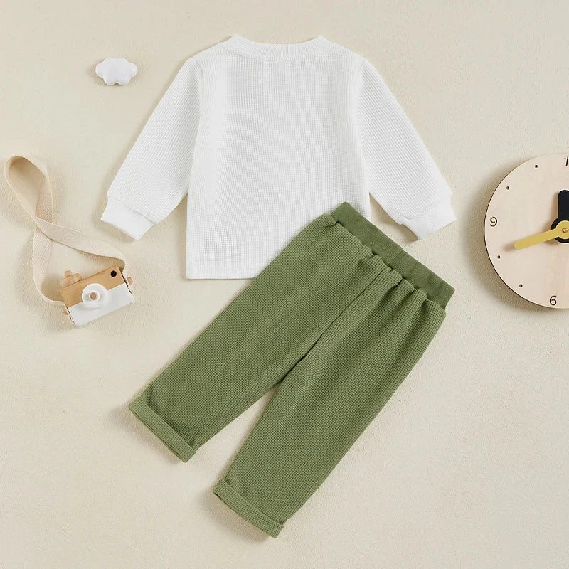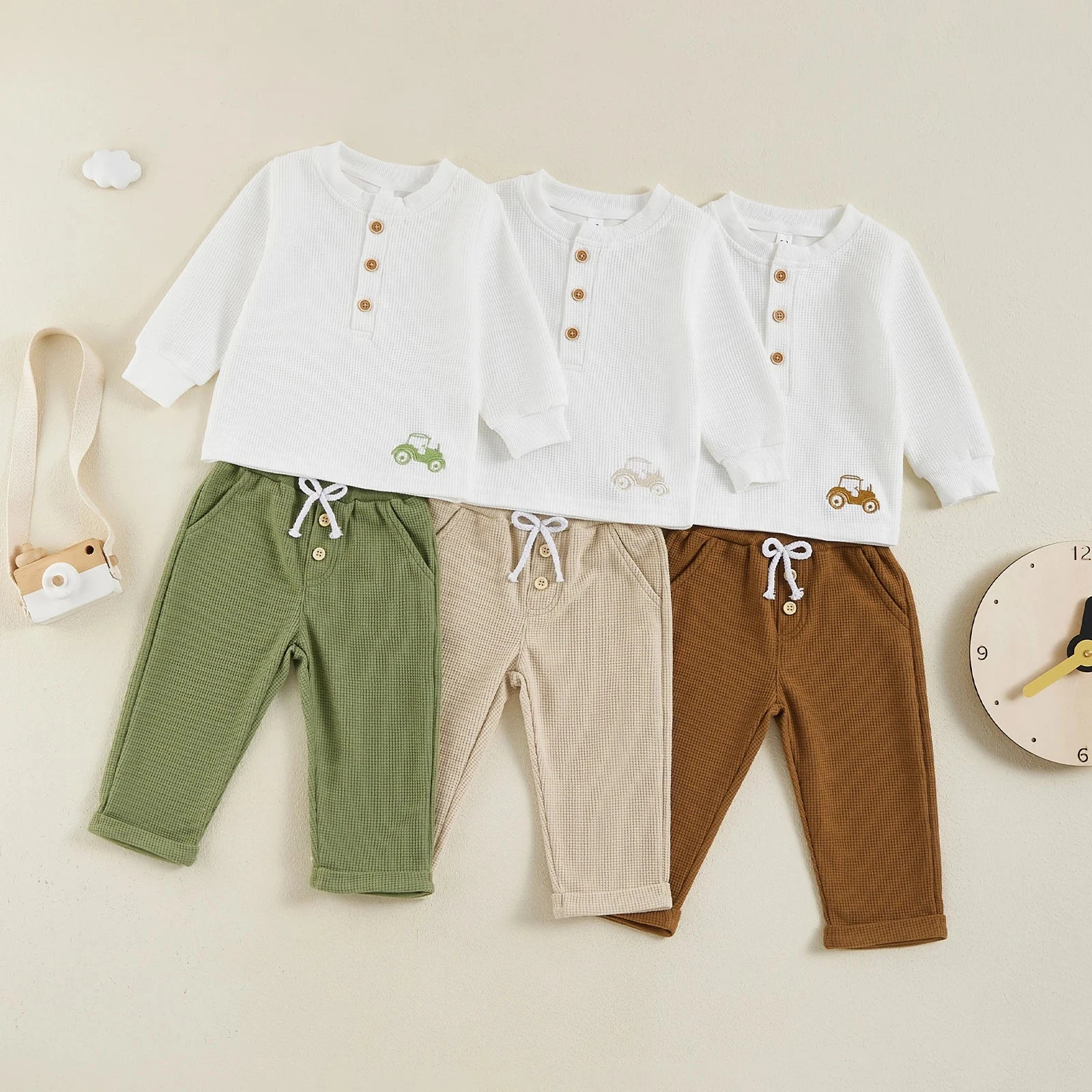 This is an adorable 2-piece outfit set for baby and toddler boys featuring a long-sleeve button embroidered tractor top with matching pants. Made from a soft cotton blend, it’s perfect for little ones who love farm vehicles and playful style. The detailed tractor embroidery adds a charming, handcrafted touch that sets this outfit apart. It solves the challenge of finding a coordinated outfit that’s both comfortable enough for everyday play and special enough for little boys who love tractors.