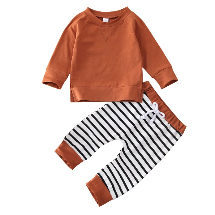 Style: Long-sleeve orange brown shirt with white and black striped pants (2-piece casual outfit)
