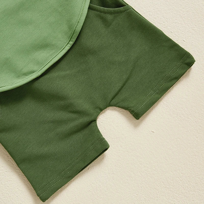 This is a fierce 2-piece outfit set for baby and toddler boys featuring a short-sleeve hooded dinosaur spike T-shirt with matching shorts. Made from a soft cotton blend, it’s perfect for little ones who love prehistoric style with an edge. The cool dinosaur spike detail on the hood adds a playful, roarsome touch that sets this outfit apart. It solves the challenge of finding a coordinated outfit that’s both comfortable enough for warm-weather play and exciting enough for dinosaur enthusiasts.