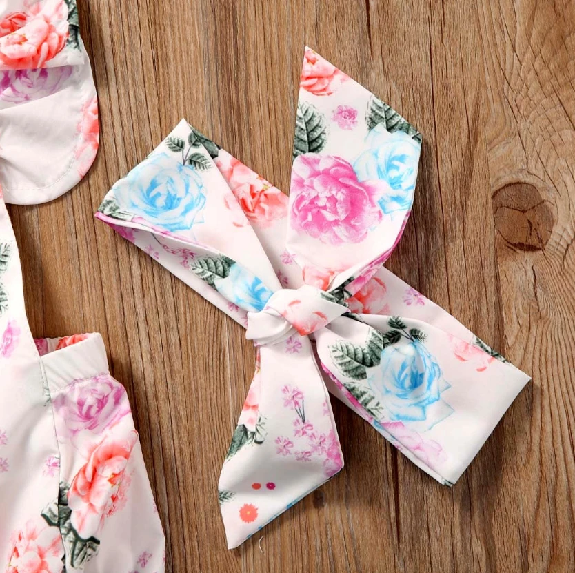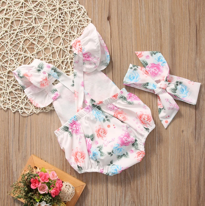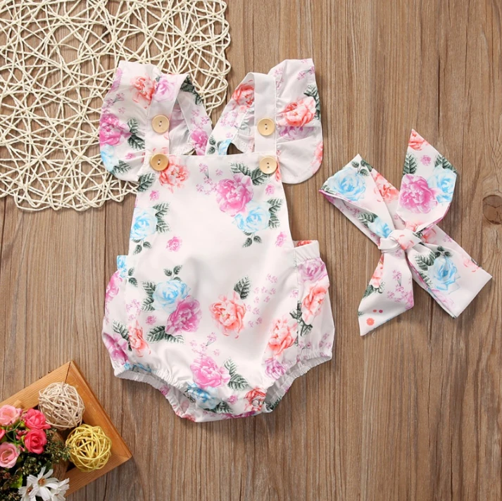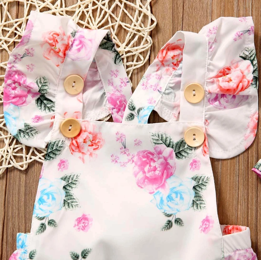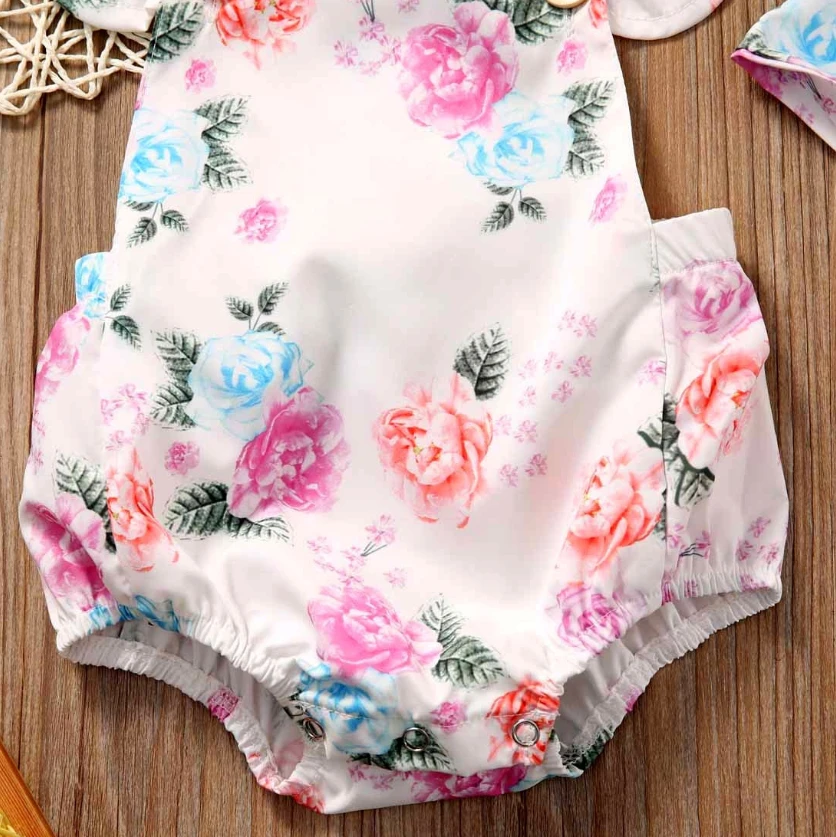 Style: Sleeveless floral romper with matching bow (2-piece outfit)