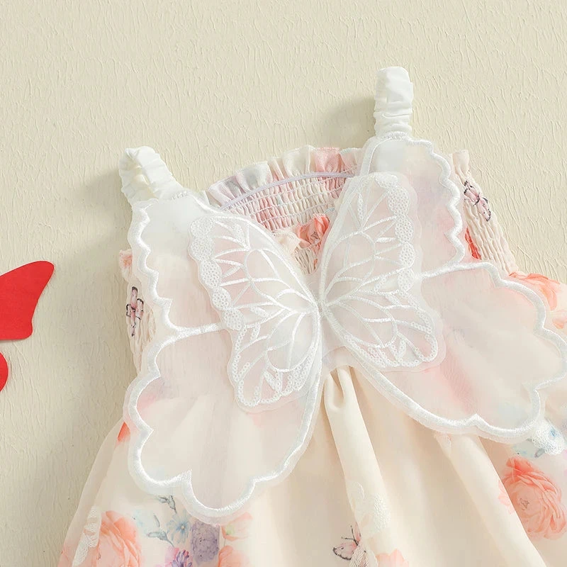 This is a sleeveless floral butterfly print dress for toddler girls who love whimsical, nature-inspired style. Made from soft polyester, it features a beautiful combination of delicate florals and fluttering butterflies that create a magical, garden-fresh design. Perfect for warm-weather days, it solves the challenge of finding a dress that’s both playful enough for everyday adventures and pretty enough for special moments.