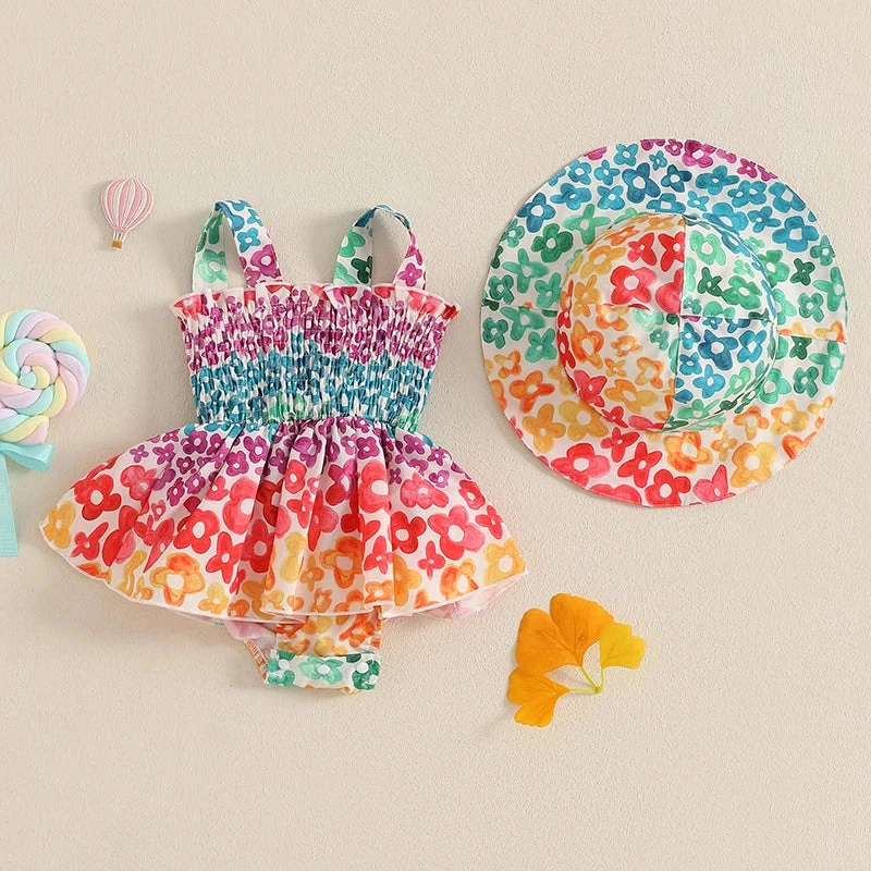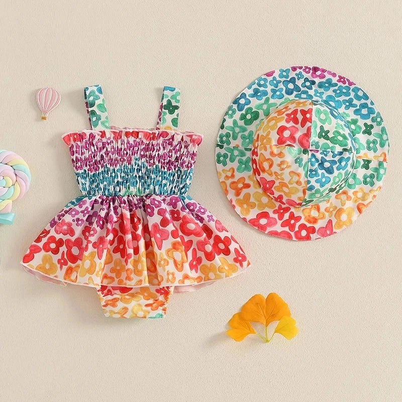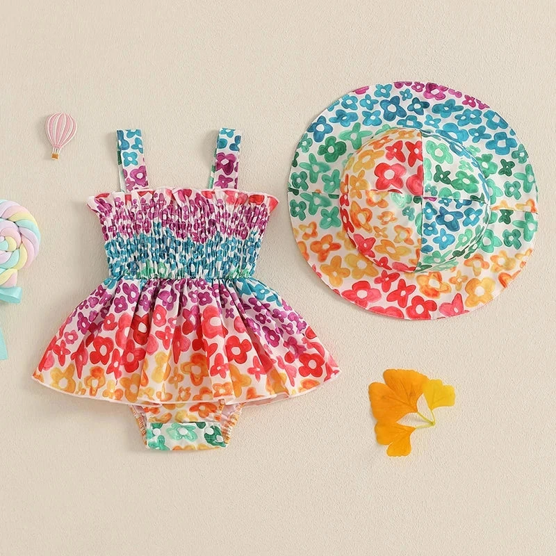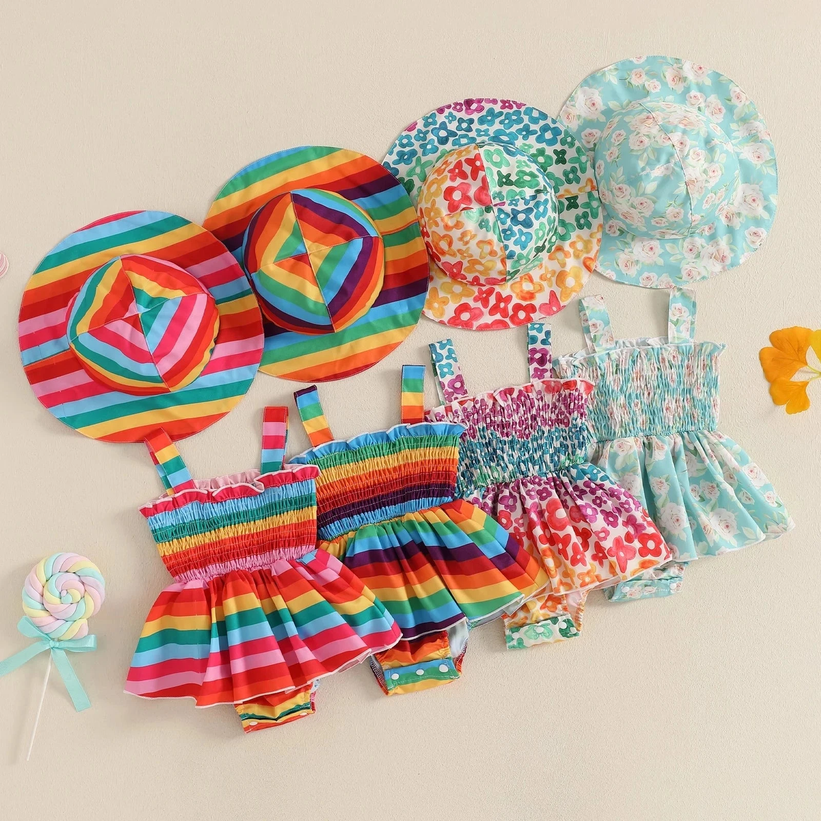 Style: Sleeveless floral or striped print romper dress with matching hat (2-piece outfit set)