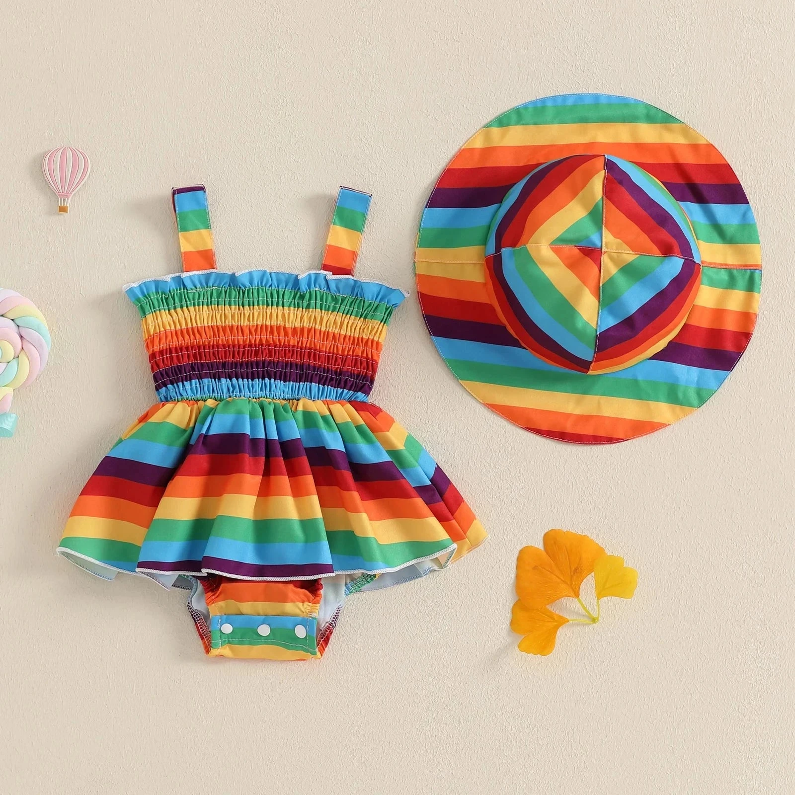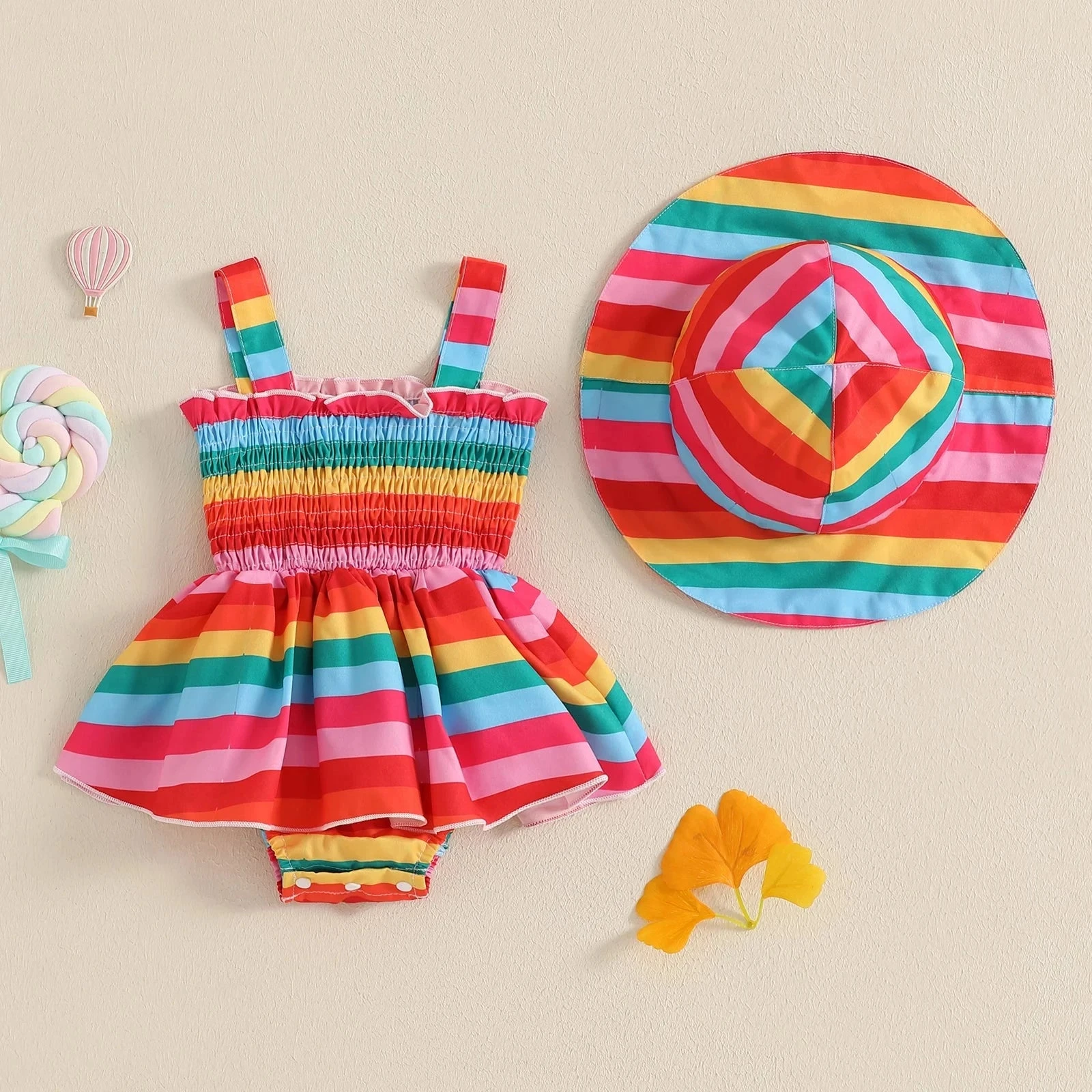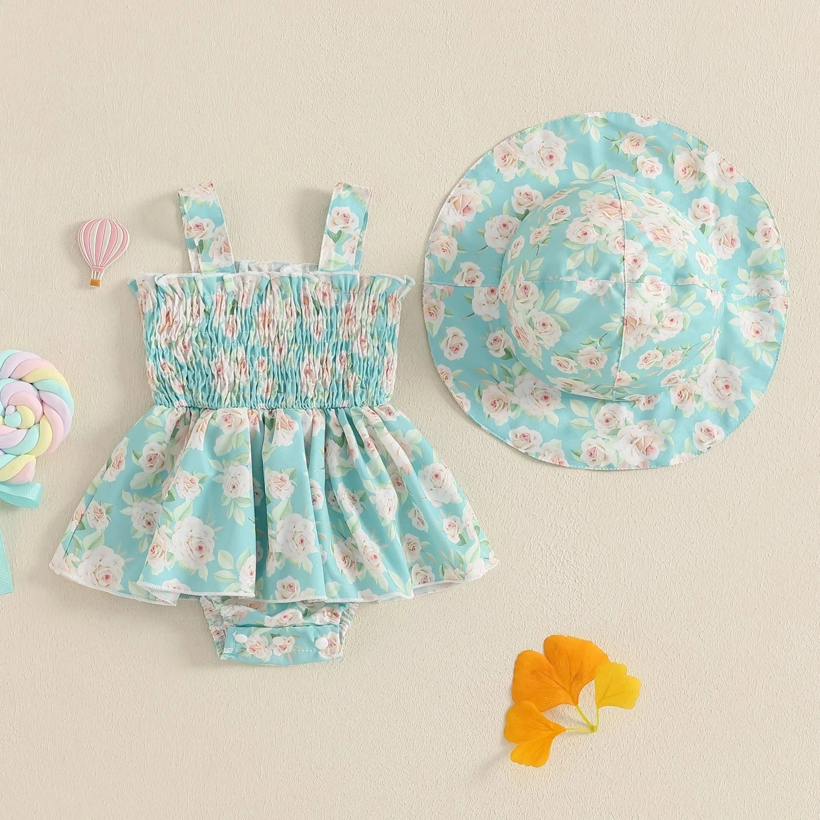 Style: Sleeveless floral or striped print romper dress with matching hat (2-piece outfit set)