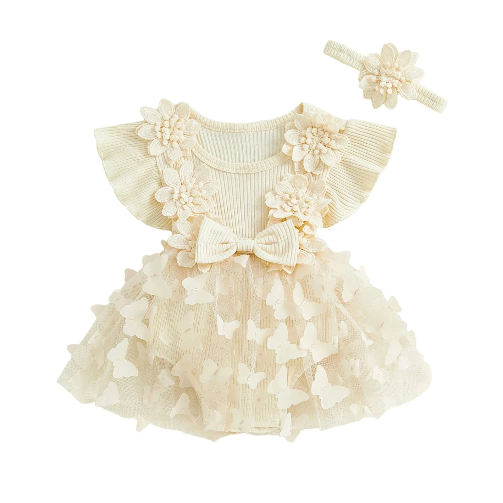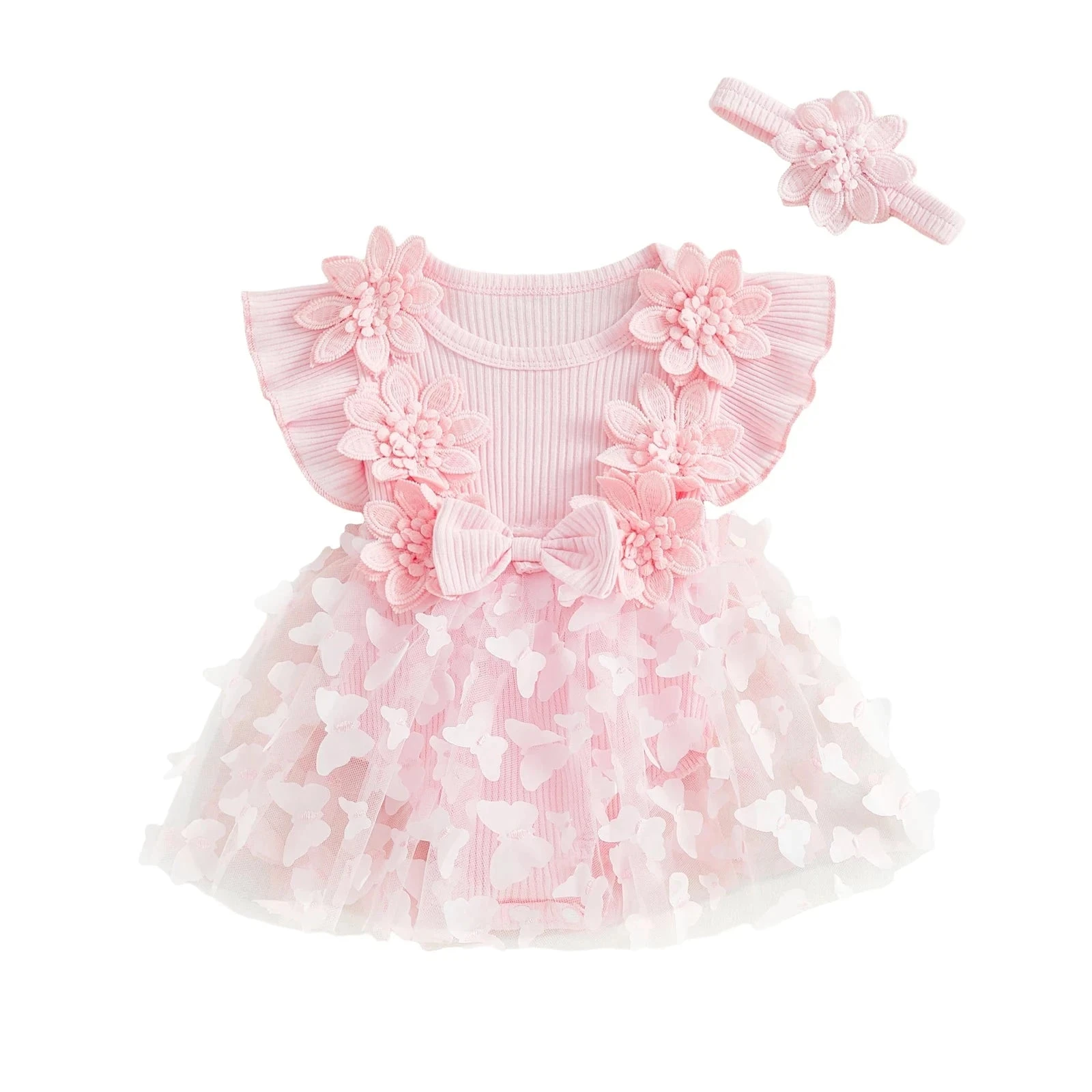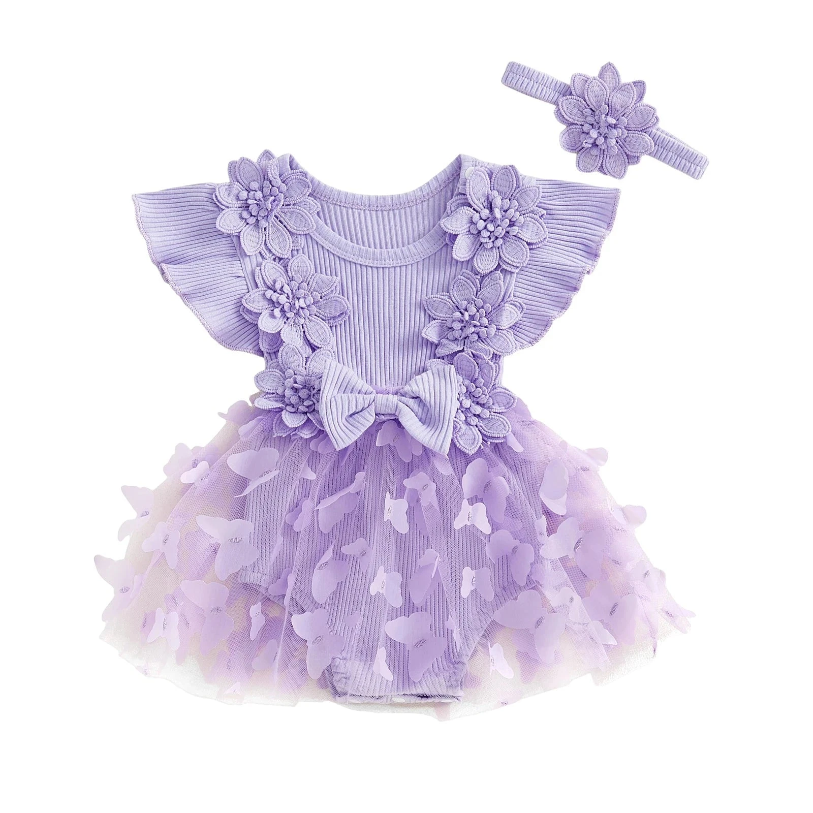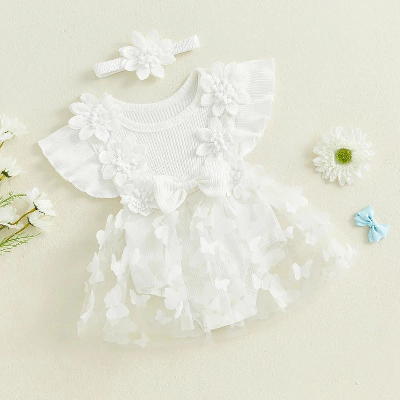 Style: Short sleeve ribbed butterfly flower dress with matching headband (2-piece set)