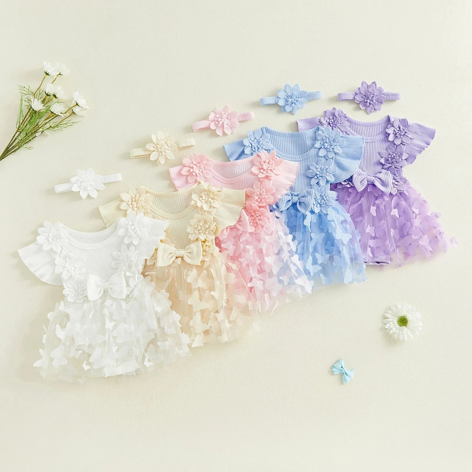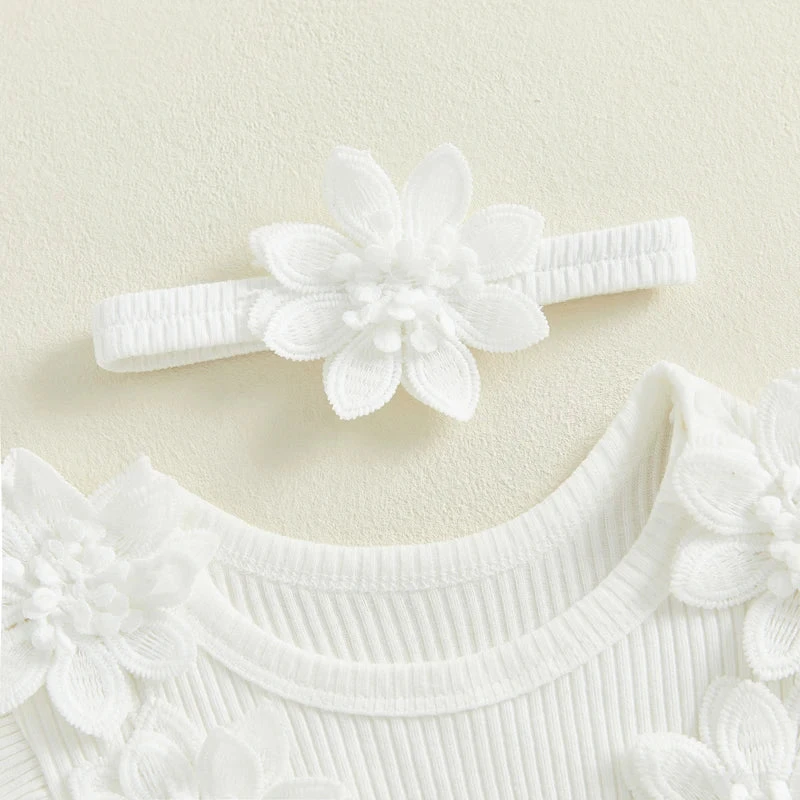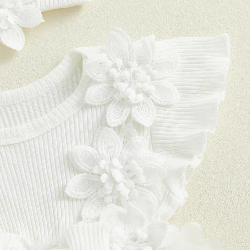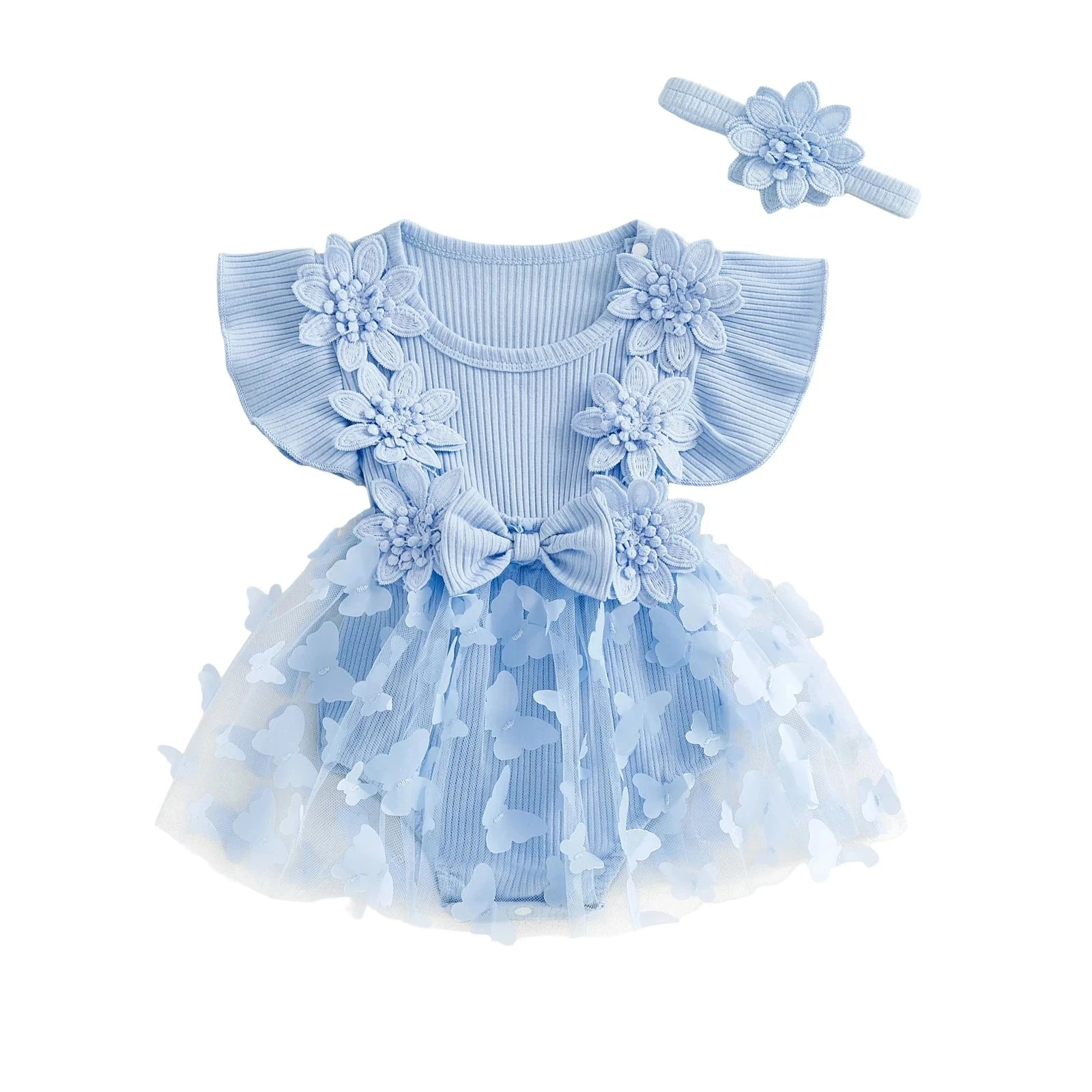 Style: Short sleeve ribbed butterfly flower dress with matching headband (2-piece set)