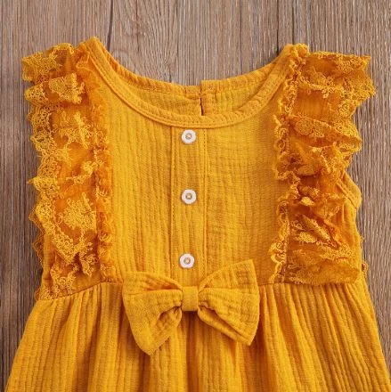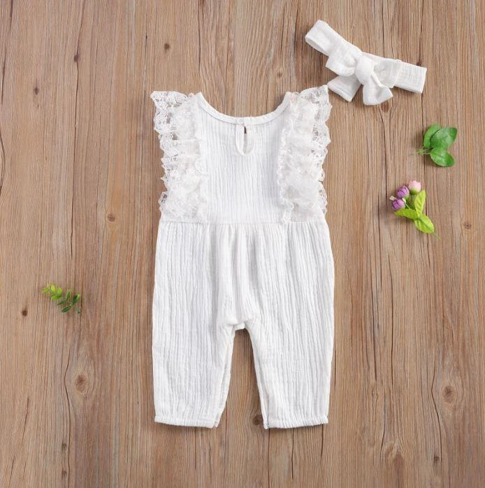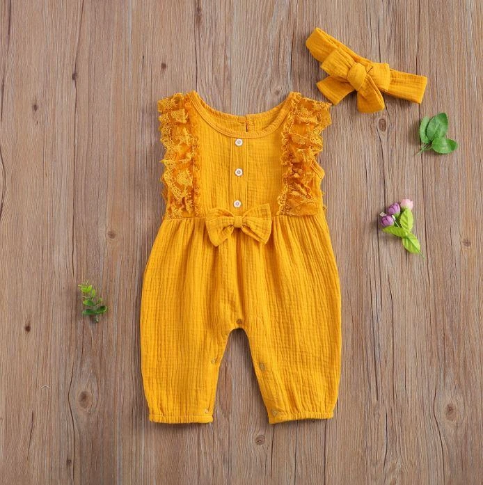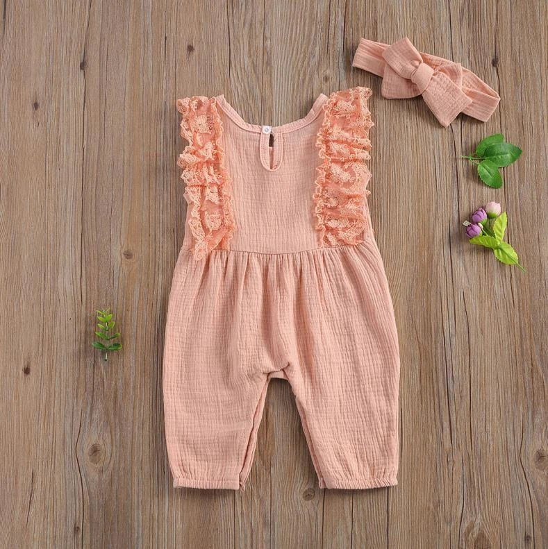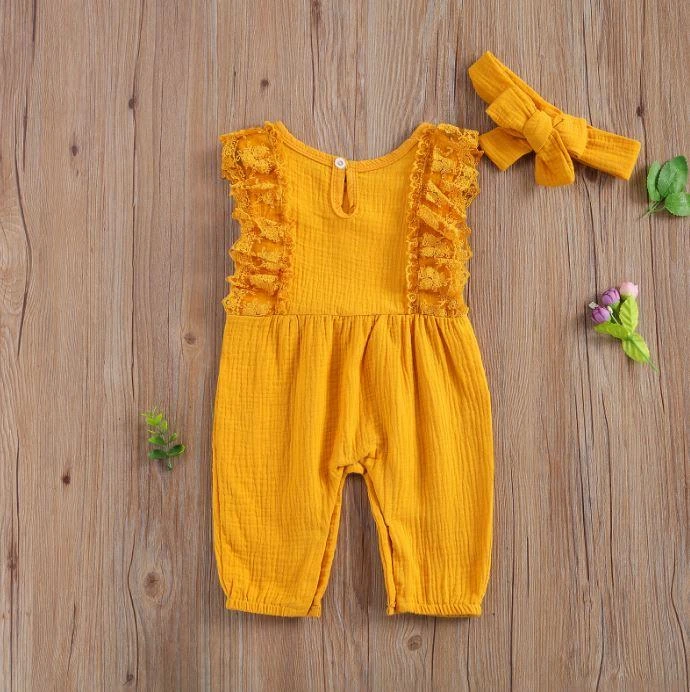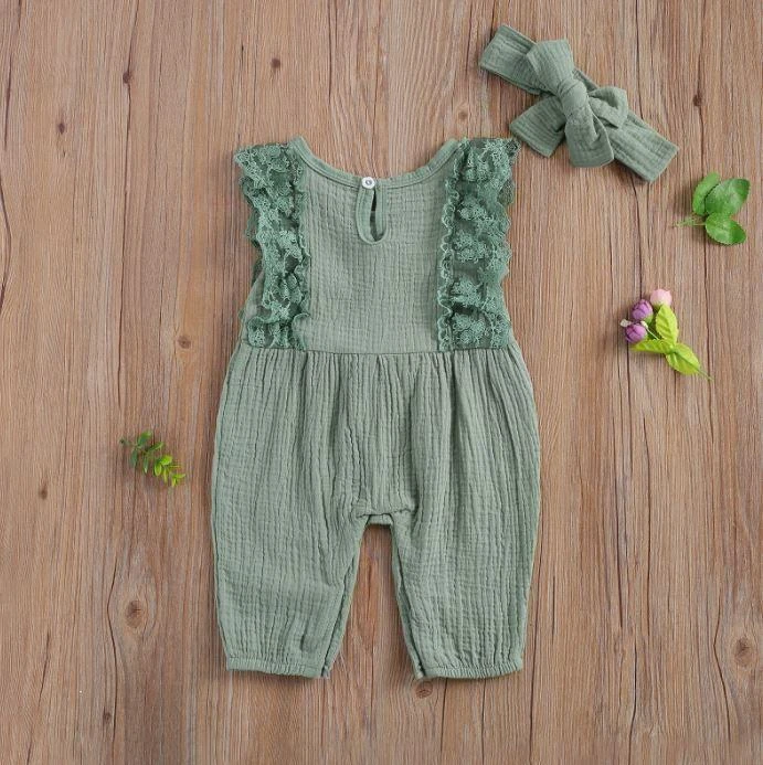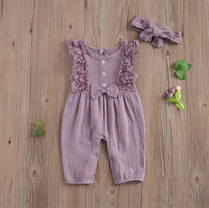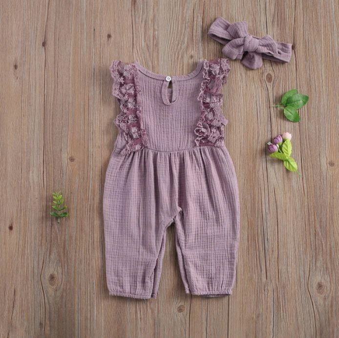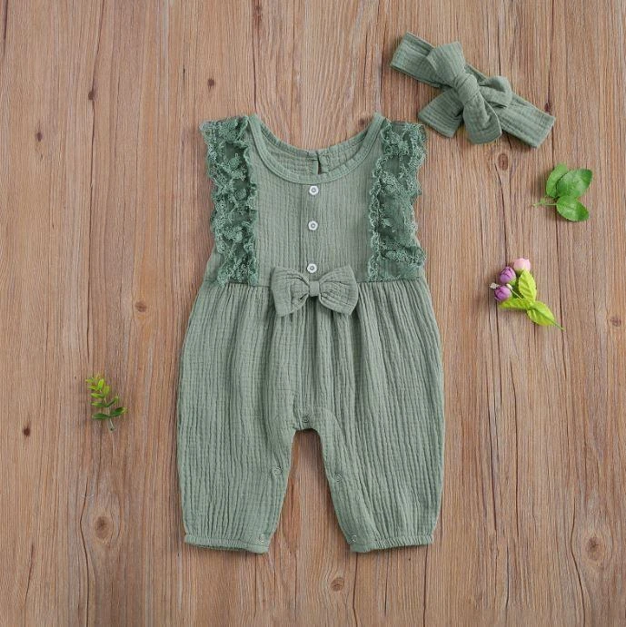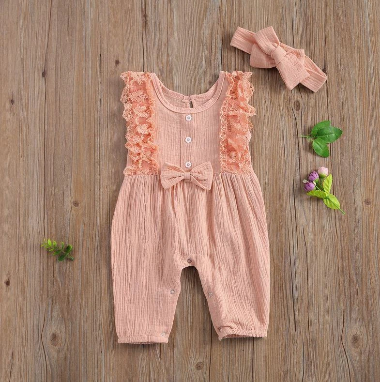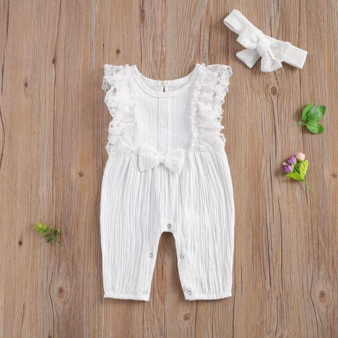 This is an adorable 2-piece set for baby and toddler girls featuring a sleeveless solid ruffled lace romper with a matching bow. Made from a soft cotton blend, it combines classic solid simplicity with delicate lace and ruffle details for extra charm. The coordinating bow completes the sweet look. It solves the challenge of finding a complete, coordinated outfit that’s both comfortable enough for everyday play and pretty enough for special occasions.