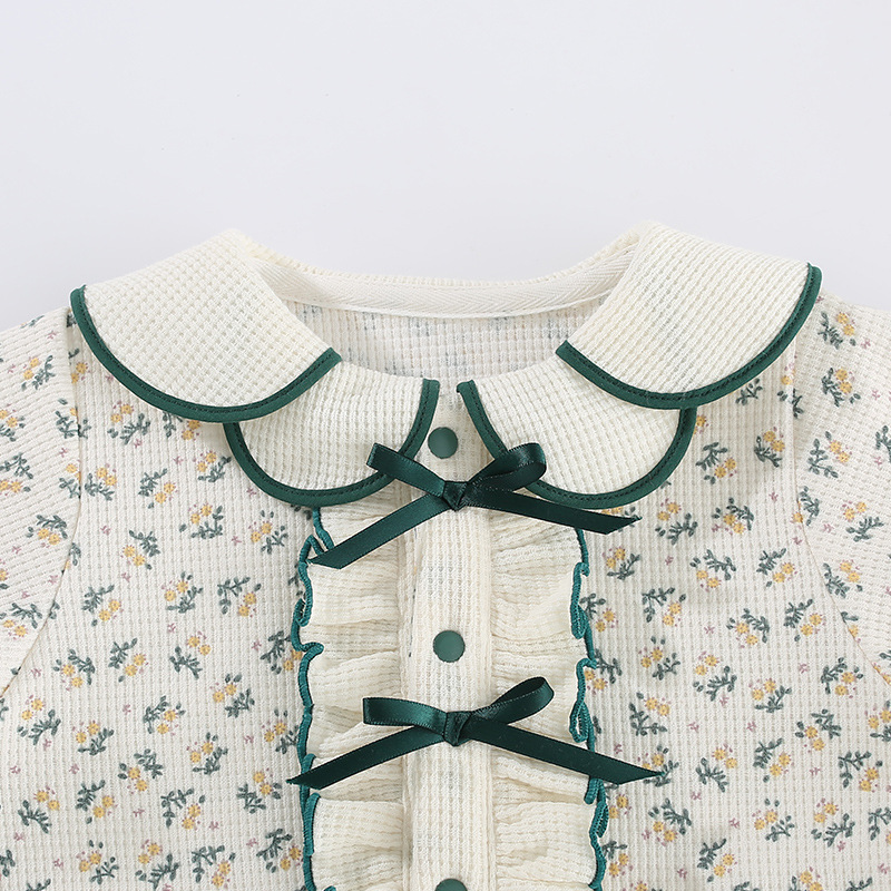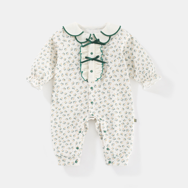This is a long-sleeve small floral print romper for newborn baby girls ages 0-1 years who need soft, comfortable, and adorable everyday wear. Made from 65% polyester with a rustic style design and Class A safety rating, it features a charming floral pattern perfect for spring and autumn. The boneless construction ensures smooth seams against delicate skin.