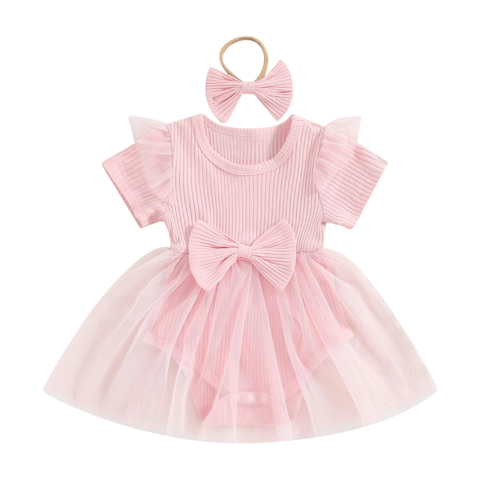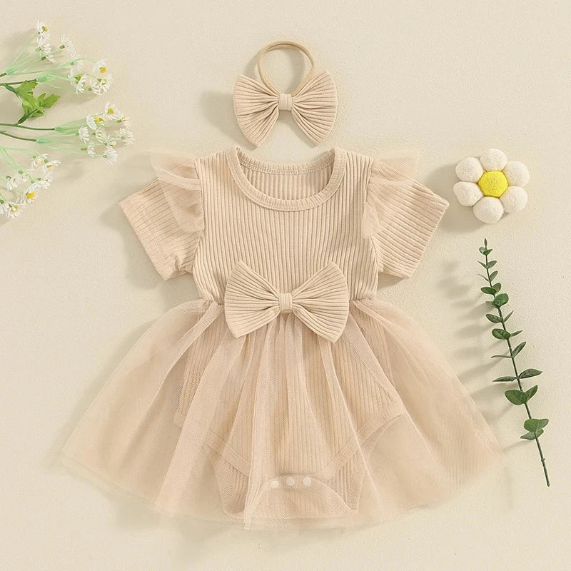 Style: Short sleeve ribbed bow dress with matching headband (2-piece set)